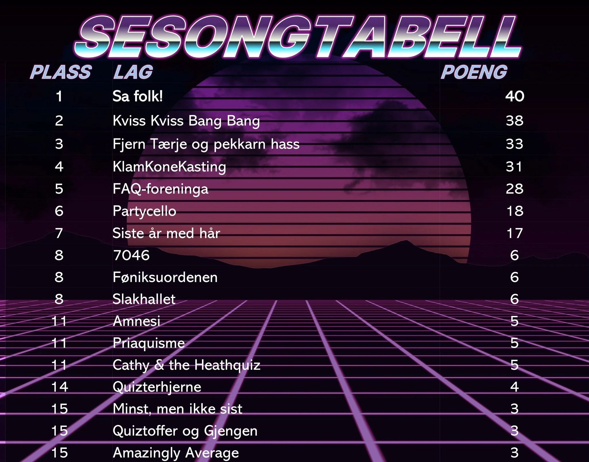 Litt forsinka med resultatene denne gangen, vi har noen jern i ilden (host, hark, Quizkverna presenterer: Den Store Quizen) som enkelte kanskje har fått med seg. Okke som, her er de: